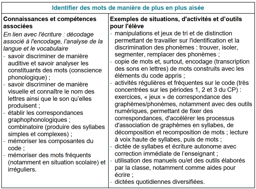 Cela nécessite pour chacun d’être clair sur les programmes car certaines activités que l’on voit souvent dans les classes sont parfois classées en « orthographe » alors qu’elles relèvent de l’identification des mots, champ qui relève de la lecture dans les programmes :