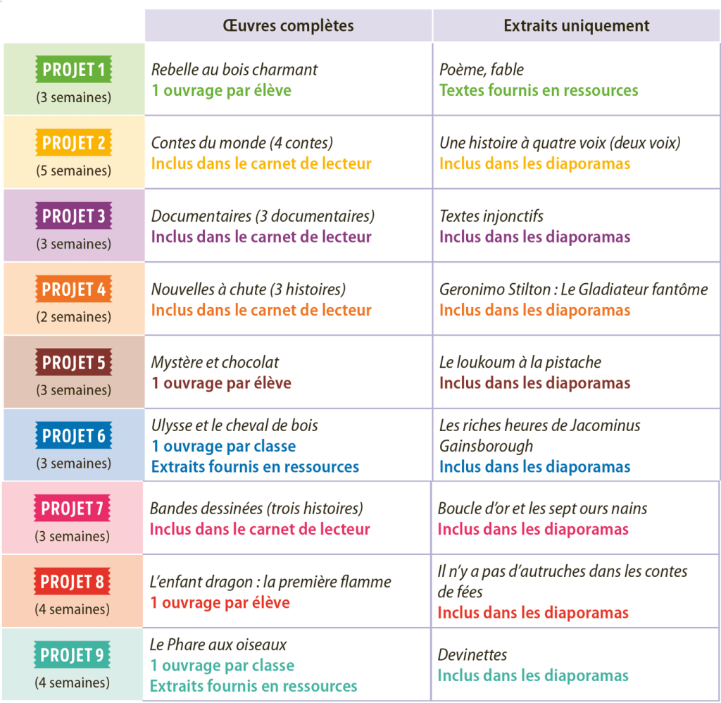 C’est sur la base des attentes institutionnelles que les choix d’ouvrages ont été arrêtés dans ce guide. Nous proposons ainsi des projets de durées variables, chaque projet s’appuyant sur une œuvre complète ou des parties d’œuvres et en parallèle des extraits d’une autre œuvre pour apprendre les stratégies de lecture ou travailler les techniques de lecture.